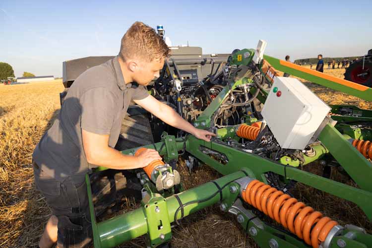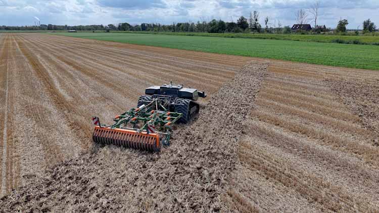 Mechanische onkruidbeheersing in de stoppel. Marijn Vermue demonstreert AgBot met slimme cultivator.
