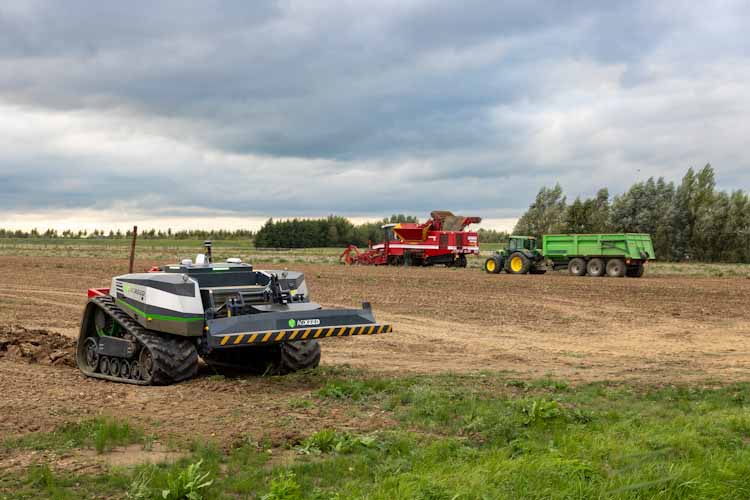Akkerbouwer Marijn Vermue rooit aardappelen en laat de AgXeed AgBot met diepwoeler achter de rooier aan rijden.