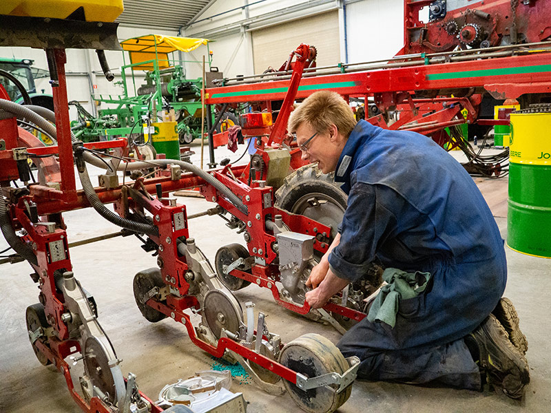 Op een ‘zwaardere’ hoek van 35 tot 40% afslibbaar varieerde hij in rijafstand door niet standaard 50 cm aan te houden, maar ook 45, 40 en zelfs 37,5. Per hectare gebruikte hij dezelfde hoeveelheid zaad. In de rij liggen de zaden nu dus verder uit elkaar en niet standaard 19 of 20 cm, maar oplopend tot 25 cm. Technisch is dit geen probleem. Sturm: ‘’We hebben een Agricola precisiezaaimachine voor groenten en een enorme hoeveelheid schijven. Het verstellen van de zaai-elementen doen we zelf.’’