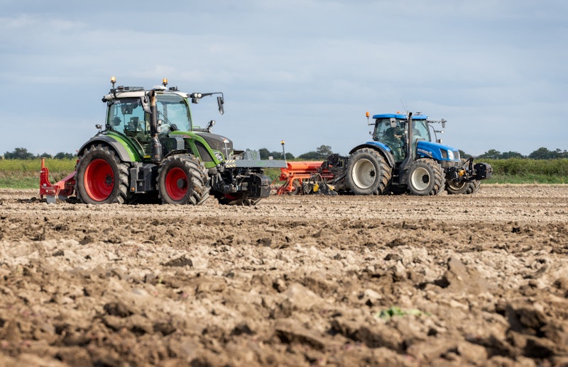 We treffen Jits aan met de trekker op het uienland. De autonome trekker maakt de grond met een woeler los en tegelijk volgt Jits met een andere trekker met rotorkopeg en zaaimachine om in het perceel een groenbemester te zaaien. Het is zijn eerste kennismaking met de autonome trekker.