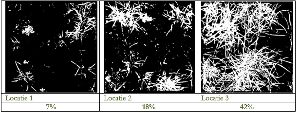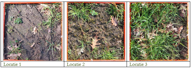 Grondbedekking gemeten op een gestandaardiseerde manier in een kader van een kwart vierkante meter. Boven de foto’s, onder de berekende bedekking van de bodem met groen. (foto’s/illustratie: Jean-Marie Michielsen (WUR)
