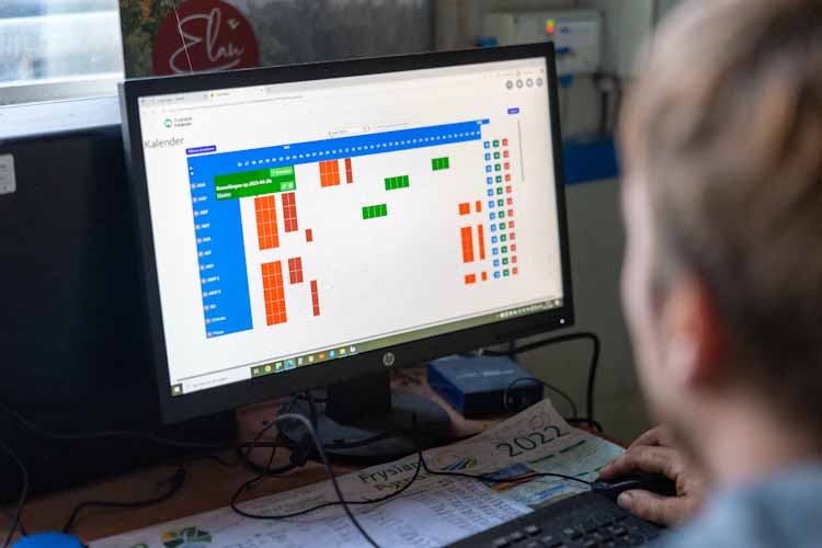 In de digitale graslandkalender ziet Duco Hoogsteen aan de verschillende kleuren blokjes wanneer is gemaaid, bemest, beweid of bekalkt. `Het mooie is dat je terug kunt kijken, dat levert leerpunten op voor bijsturing in het volgende seizoen´.