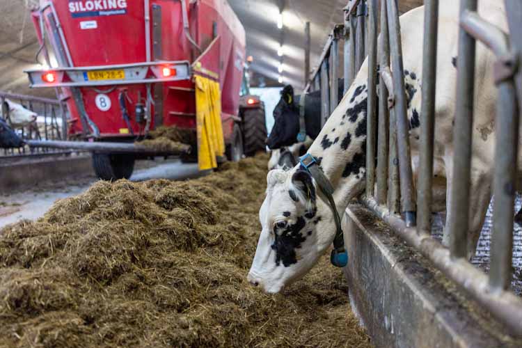 In 2019 zijn de maten na de eerste snede gras gestopt met kunstmest strooien. ‘We bemesten nu niet meer dan dertig kuub drijfmest per hectare, meestal voor begin juli zowel voor maai- als weidepercelen. We verdelen dit over drie tot vier porties van tien kuub per keer bovengronds.’ Dit jaar hebben ze vijf sneden gras geoogst met een geschatte opbrengst van in totaal 9.800 kilo gras per hectare. ‘Toen we nog kunstmest strooiden, zaten we altijd op twaalf ton grasopbrengst per hectare.’ In 2025 was de graskwaliteit met gemiddeld 160 RE goed. Met een ureumgehalte van 16 in de melk lijkt de stikstofbenutting ook goed. ‘Ik streef naar een RE-gehalte van 150 in onze graskuil, meestal zit het tussen 160 en 170.’ Op basis van uitgebreide bodembemonstering en een mestmonster elk voorjaar, komt er ook een mineralenmix met de veldspuit op het grasland om een mineralengebrek in gras te voorkomen. Het maaien van gras begint in de eerste week van mei, waarbij de maten om de vier weken maaien. Alle gras persen de maten in ronde balen. In 2025 leverde dat 1.400 ronde balen op met 350 tot 400 kilo droge stof per baal. ‘We zijn overgestapt op ronde balen, omdat er naar verhouding meer suiker in de graskuilen kwam vanwege een lichtere N-bemesting. We konden de broei niet uit de kuilen houden. Nu kunnen we droger inkuilen en dat zorgt voor meer bestendig eiwit in de graskuil wat de koe beter kan benutten.’
