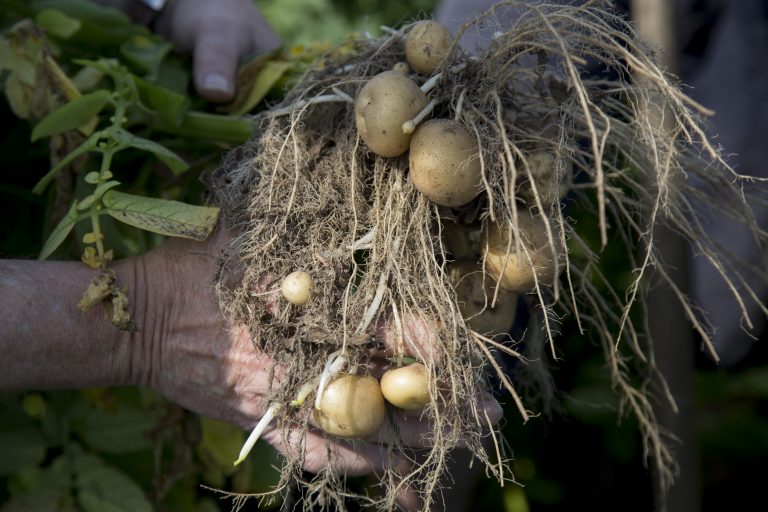 Nanne Sterenborg bekijkt hoe het ervoor staat met zijn aardappelen. Een nul-veld durfde hij nog niet aan, maar een veld met rijenbehandeling werd wel gepoot eerder dit seizoen.