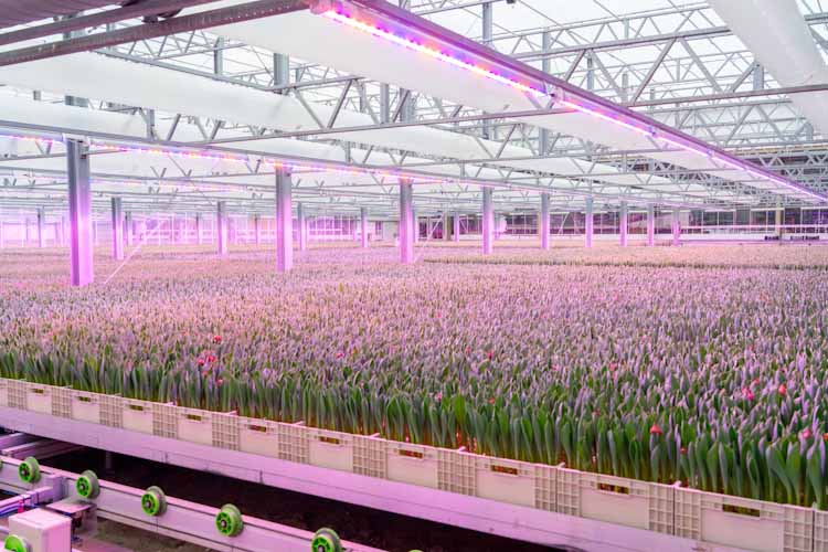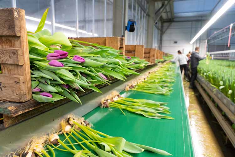 Stef Ruiter (links) en Lars Stavenuiter te midden van de tulpenkas. ‘Deze uitbreiding van trekker met iQuus levert meer capaciteit en geeft ons de kans om dingen uit te proberen.’