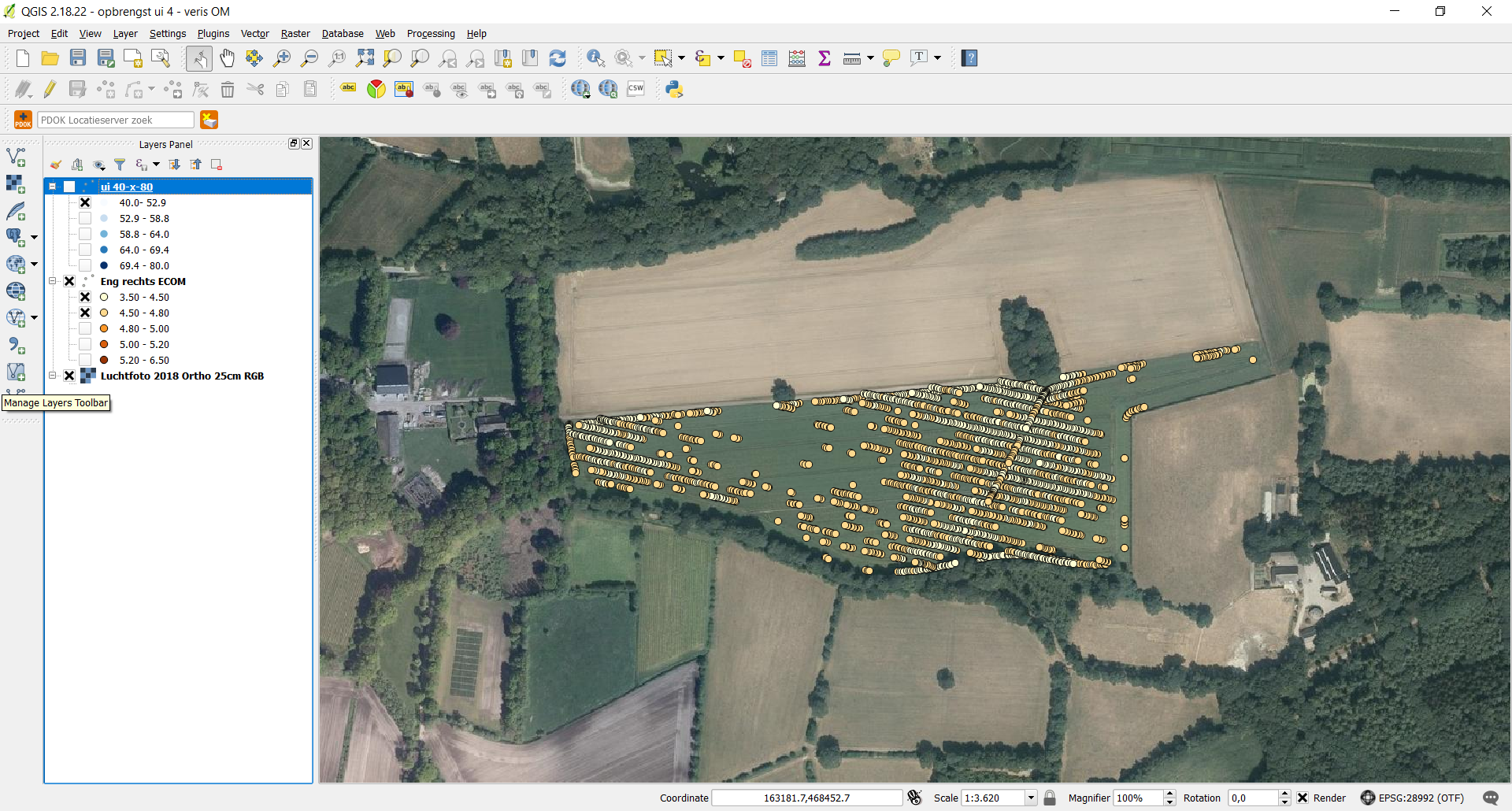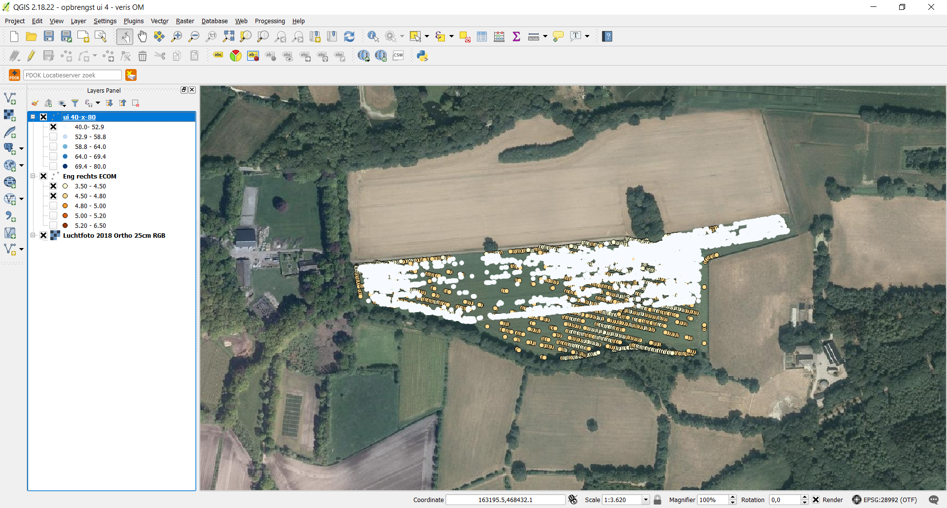Nu leek het me interessant om deze opbrengstdata te vergelijken met de bodemscan van dit perceel. Het perceel ligt op zandgrond en een bepalende factor op deze grond is het organischestofgehalte, wat varieert van 3,5 – 6,5%. Met behulp van een programma (QGis) leg ik de opbrengstdata over de bodemscan data. Dat ziet er dan zo uit.