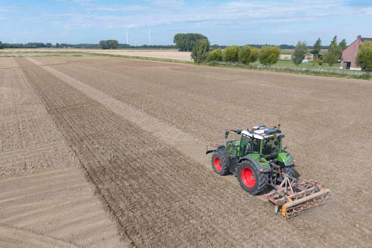 Bollen planten is een keten van vrijwel gelijktijdige bewerkingen. Djurre Kool houdt bij de Groencompagnie vanaf de trekker een oogje in het zeil op de trekker die autonoom voor de ploeg uit grasland freest.