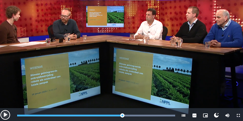 Tijdens het webinar vertelde biologisch akkerbouwer Jaco Rodenburg dat hij tijdens de NPPL-proeven met de Ekobot (een autonome onkruidbestrijdingsrobot) in uien, geregeld contact had met Zweden. De software-engineers daar konden dan de voor hem nodige aanpassingen op de robot doen. Het gaf een glimp in de toekomst van de Nederlandse boer. Die zal steeds vaker een beroep moeten gaan doen op robots om de strijd met onkruid aan te kunnen gaan. Immers er komen minder chemische middelen op de markt en arbeid is duur of niet te vinden.