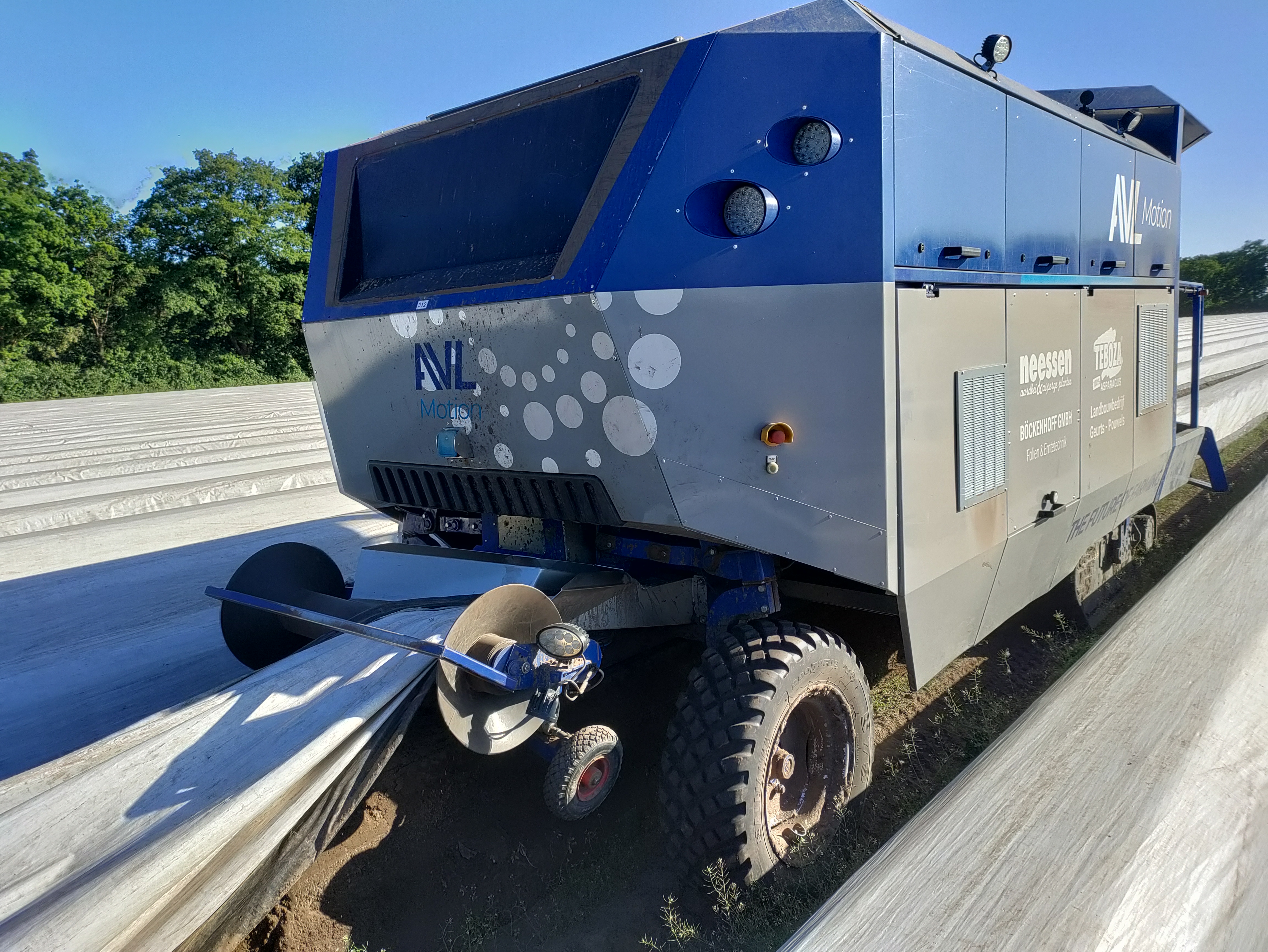 Van Lankveld: ‘Vanaf het allereerste moment was duidelijk dat de oogstrobot compact moest worden, met een oogstrij per werkgang, met één operator voor het werk op en rond de machine. En, minstens zo belangrijk, de betrouwbaarheid moet goed zijn.’ De robot is circa 6 meter lang en 2,4 meter breed. Vijf meter manoeuvreerruimte is voldoende om het apparaat in een keer tussen de werkgangen te keren. De bediening gaat met een radiografische afstandsbediening. Het in-bedrijf stellen aan het begin van een werkgang is doordacht. Dat geldt met name voor de invoer van de afdekfolie. De operator drukt het begin van de foliestrook in het invoerkanaal aan de voorkant van de oogster. Met een druk op de knop wordt de strook vervolgens automatisch door een kanaal aan de zijkant van de machine geleidt, dus uit de buurt van het oogstsysteem, en komt er aan de achterkant uit. Dit proces duurt een paar seconden, zonder inspanning en zonder kans op een nat pak vanwege regenwater op de folie.