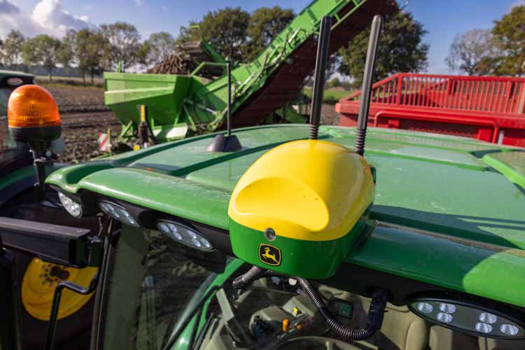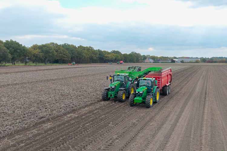 Machine Sync van fabrikant John Deere synchroniseert rijsnelheid en positie van een oogstvoertuig of -combinatie met een afvoercombinatie zodat die laatste – in theorie althans – onbemand z’n werk kan doen. Wat kan het systeem betekenen tijdens de aardappeloogst? Levert het ook winst voor de bodemstructuur op? Dit zijn de eerste ervaringen van een praktijkproef in Esbeek.