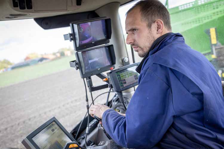 Tijdens een eerste NPPL-praktijkproef met het Machine Sync systeem tijdens het rooien van aardappelen blijkt dat het verdelen van aandacht en voldoende zicht houden op de losband en de kipper de grootste uitdaging vormen voor de chauffeur van de rooicombinatie.