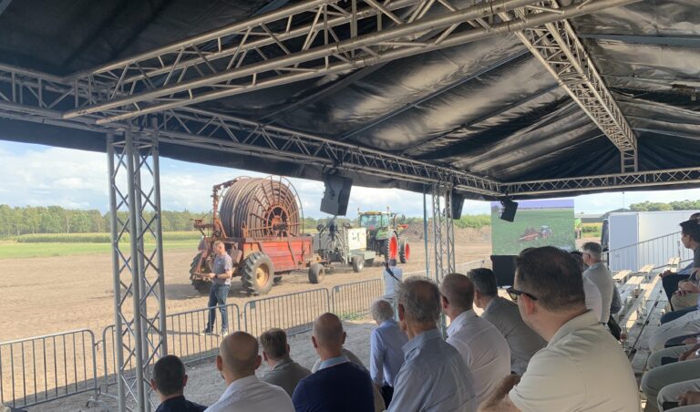 Innovaties uit de afgelopen jaren kwamen voorbij, zoals de Rauch Axent 100.i. Dit is een grote getrokken strooier met een bunkerinhoud van tien ton en een uitwisselbare strooimodule waarmee zowel kunstmest als kalk kan worden gestrooid. En een zelfrijdende oogstmachine van AVR, die via een sensor boven op de machine het gewicht meet van de aardappelen die in de bunker vallen. Dit systeem is doorontwikkeld naar de mogelijkheid om met een camera elke seconde de aardappelen in beeld te brengen, zodat direct sortering is te bepalen. Maar ook een al langer in gebruik zijnde beregeningsinstallatie van het Deense merk Fasterholt kwam langs. Deze zelfrijdende haspel kan bochten maken en zo efficiënter beregenen dan andere systemen. Alles wordt in het werk gesteld om efficiënt te werken op alle gebieden, zo toonde Van den Borne. Hij vertelde tijdens de show ook over een spanningsveld tussen wat mogelijk is en wat mag. Soms is dat nog complexer, omdat hij ook veel in België doet en daar weer andere regels gelden dan in Nederland. Als voorbeeld liet hij een drone overvliegen die geschikt is om te bemesten, maar daarvoor wettelijk te zwaar is. Zonde, vindt hij, want deze drone heeft juist als voordeel dat bodemverdichting door gebruik van zware machines wordt tegengegaan. Maar wat er kan, zal uiteindelijk ook worden toegepast, is zijn overtuiging.