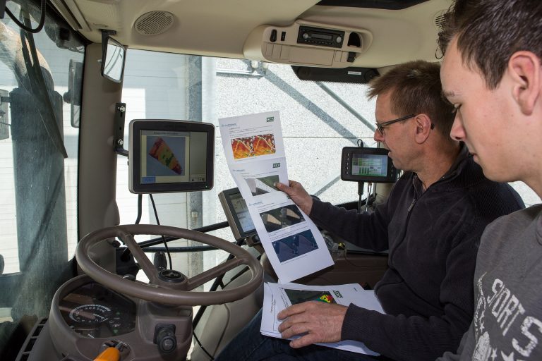 Het water staat begin mei nog her en der tussen de verse aardappelruggen op Zeeuws-Vlaanderen. Blinkende slijtdelen van een verder fonkelnieuwe getrokken pootmachine getuigen dat ook akkerbouwer De Meijer al wat hectares in de grond heeft zitten. Nu staat de combi bijgevolg even werkloos op de betonplaten achter het huis. Akkerbouwer Martin de Meijer en zoon Sten benutten de noodgedwongen adempauze in het pootseizoen om nog wat details uit te puzzelen in de cabine. Met name de instellingen van de Isobus-terminal en de pootcomputer. De Meijer: “De kans om met deze demo-machine nu plaatsspecifiek variabel te poten kwam toevallig op mijn pad, en kon ik niet laten schieten.”